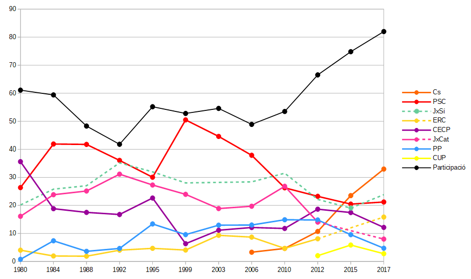 | Any | Cs | % | PSC | % | JxSí | % | ERC | % | CECP | % | JxCat | % | PP | % | CUP | % | Altres | Bl. | Nul | Part. | % |